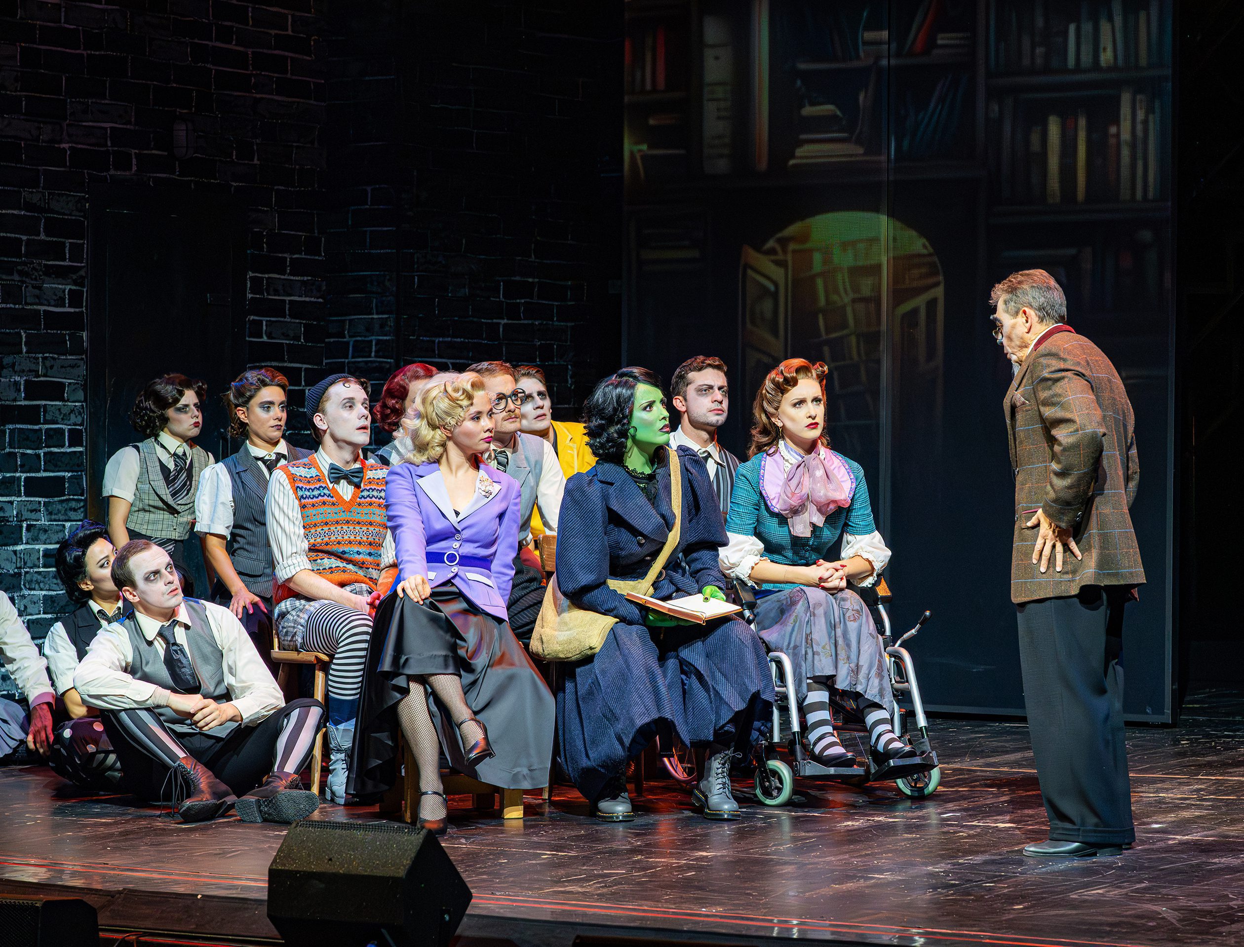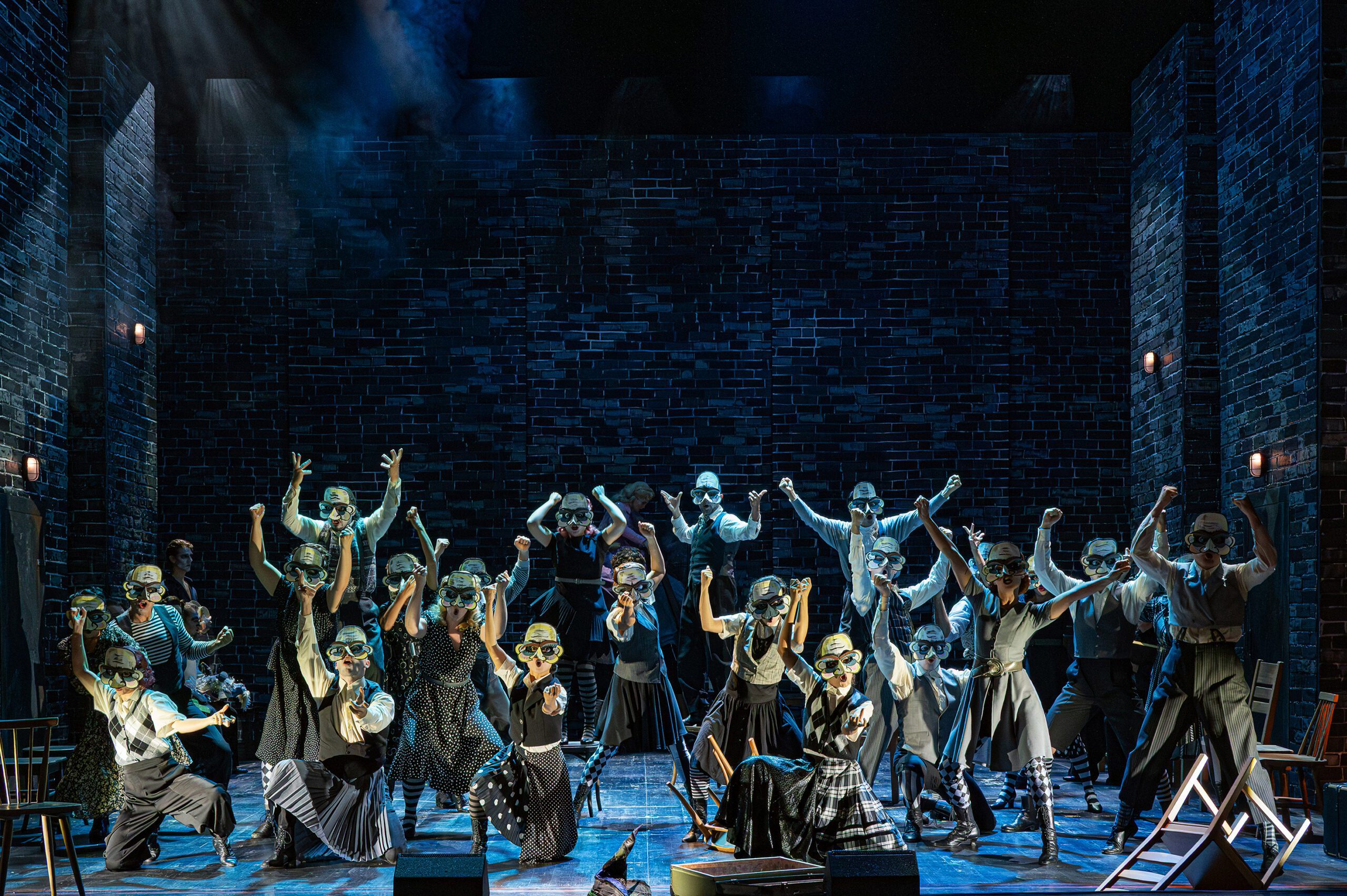 Und in kreativer Hinsicht? Macht der selbst inszenierende Gergen alles richtig, ohne sonderlich zu überraschen. Denn wer „Wicked“ kennt, weiß, dass es viel mehr als nur ein oberflächlicher „Blockbuster“ ist – und genau diese inhaltliche Tiefe arbeitet die Regie abseits von technischem Long-Run-Bombast zielsicher heraus. „Tiere sind nicht der Rede wert!“, werden mundtot gemacht, ausgegrenzt, gequält, gebrochen, ausgelöscht – Parallelen zu den autoritär-diktatorischen Systemen vergangener und heutiger Zeiten: alles andere als zufällig. Die Badener Produktion im Vergleich zu früheren Pendants von Stage Entertainment & Co. als Kammerspiel zu bezeichnen, würde ihr nicht gerecht. Aber gerade die Reduktion auf den bitteren Kern der Geschichte macht diesen Abend zu einem Volltreffer, nachdem er sich erst einmal warmgelaufen hat. Momme Hinrichs (Bühne) und Claudio Pohle (Kostüme) zeigen das inmitten kalter Backsteinwände, schlichter Projektionen und gleichgeschaltet maskierter Munchkins im 1930er-Jahre-Look, die in Francesc Abós’ körperbetonten Choreos mit völkischen Zwischentönen eine Hetzjagd auf das Feindbild „Die Böse Hexe des Westens“ starten.