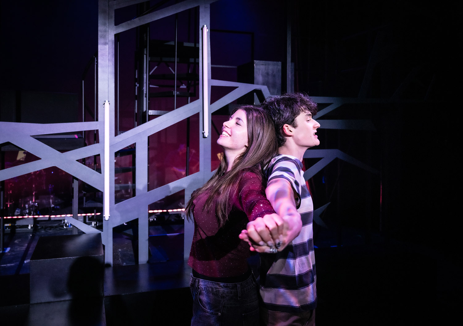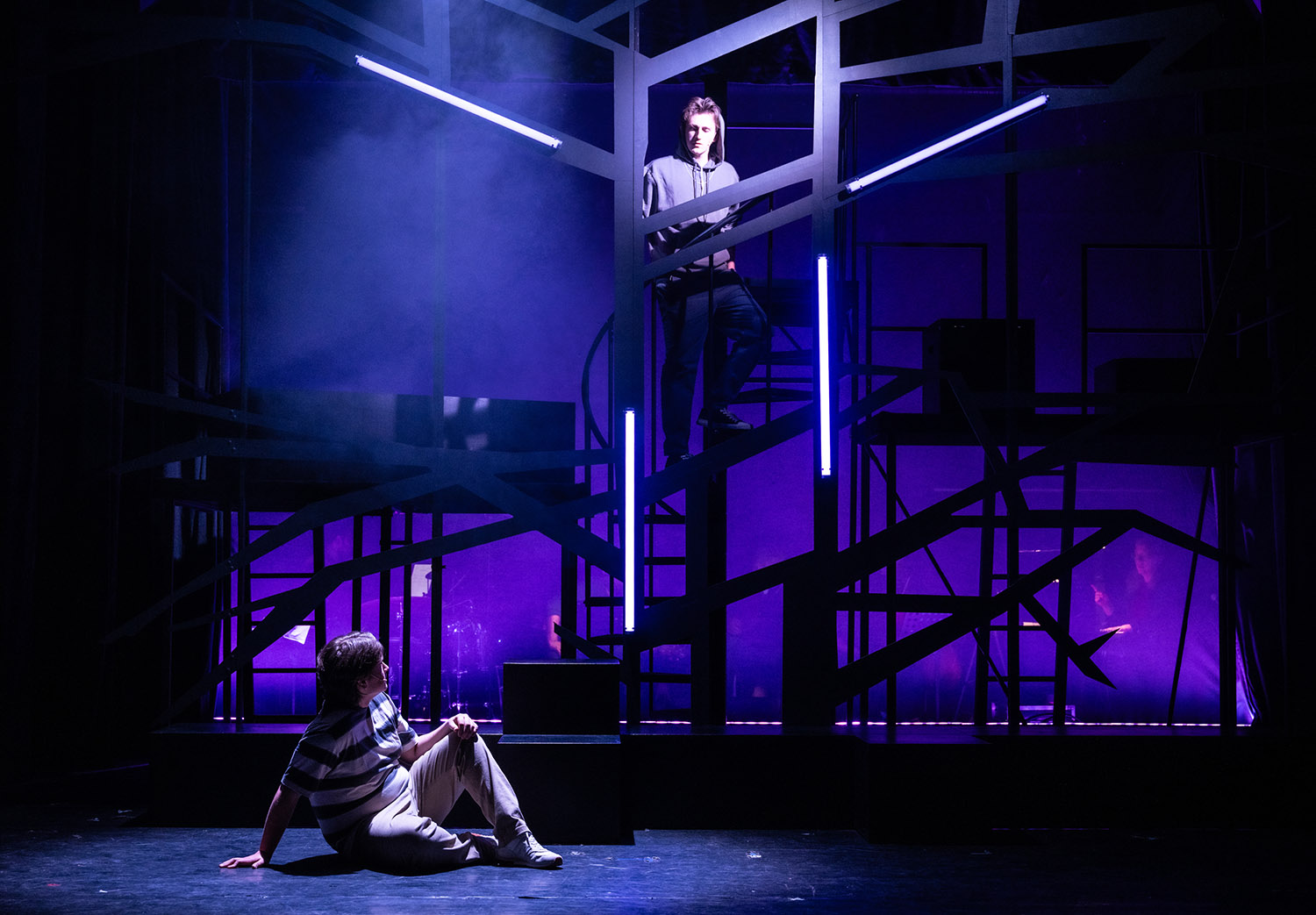 Die Musiker sind sichtbar im Hintergrund der Bühne platziert und wirken gleichzeitig wie Zeugen des Geschehens. Das sechsköpfige Ensemble spielt unter Leitung von Ekaterina Klewitz die popmusikalisch geprägte Partitur mit Lebendigkeit auf.