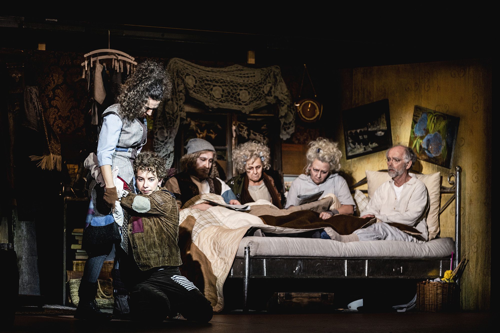 Das großflächige Bühnenbild, eine gigantische Schokoladentafel, mutiert mittels Hebebühne zur zugigen Holzhütte, Charlies Zuhause, und zum verführerischen Süßigkeiten-Shop. Hier träumt der Junge von süßen Kreationen und einem Besuch in der seit Jahren geschlossenen Fabrik, in der einst sein Großvater Joe beschäftigt war und die seltsamerweise immer noch massenweise Schokolade ausspuckt.