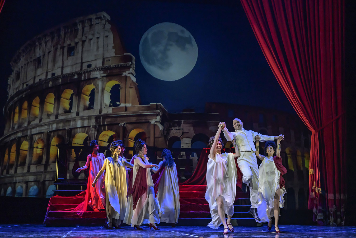 Das Problem wird durch die Akustik in Münster verschärft. Wenn man bei Liedern, die reine innere Monologe sind, kein Wort versteht – geschenkt. Aber bei handlungstragenden Stücken ist das reines Gift, erst recht, wenn viele Nebendarsteller nur sehr gebrochen Deutsch sprechen. Das Textverständnis geht schlichtweg im satten Klang des Sinfonieorchesters unter. Und was sollen die Gesangs- und Tanzszenen mit den römischen Vestalinnen vor dem Kolosseum, warum liegt Dantès auf einmal gefesselt im Abwasser? All das ist dank des schlechten Tons nicht nachvollziehbar. Deplatziert, weil einziger Bruch mit der übrigen Stilistik, sind drei Tänzerinnen in schwarzen Ganzkörperkostümen wie aus der BDMS-Szene, vermutlich aus Latex, die offenbar das Böse personifizieren sollen.