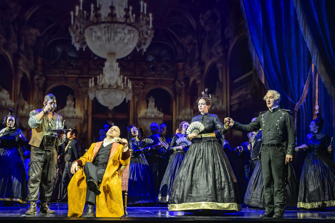 Ganze Arbeit leistet das Bühnenteam mit einer Ausstattung, die man umschreiben kann als zurückgenommenen Aufwand (Bühne: Stefan Rieckhoff / Kostüme: Uta Meenen). Den Hintergrund bilden prächtige Bild- und Videoprojektionen, die nach KI aussehen, dazu einzelne, dafür aber überbordend große Elemente, die aus dem Schnürboden herabgelassen oder auf die Bühne geschoben werden. Die übrigen Requisiten werden aufs Nötigste begrenzt, dafür wird der Kostümfundus umso effektiver geplündert.