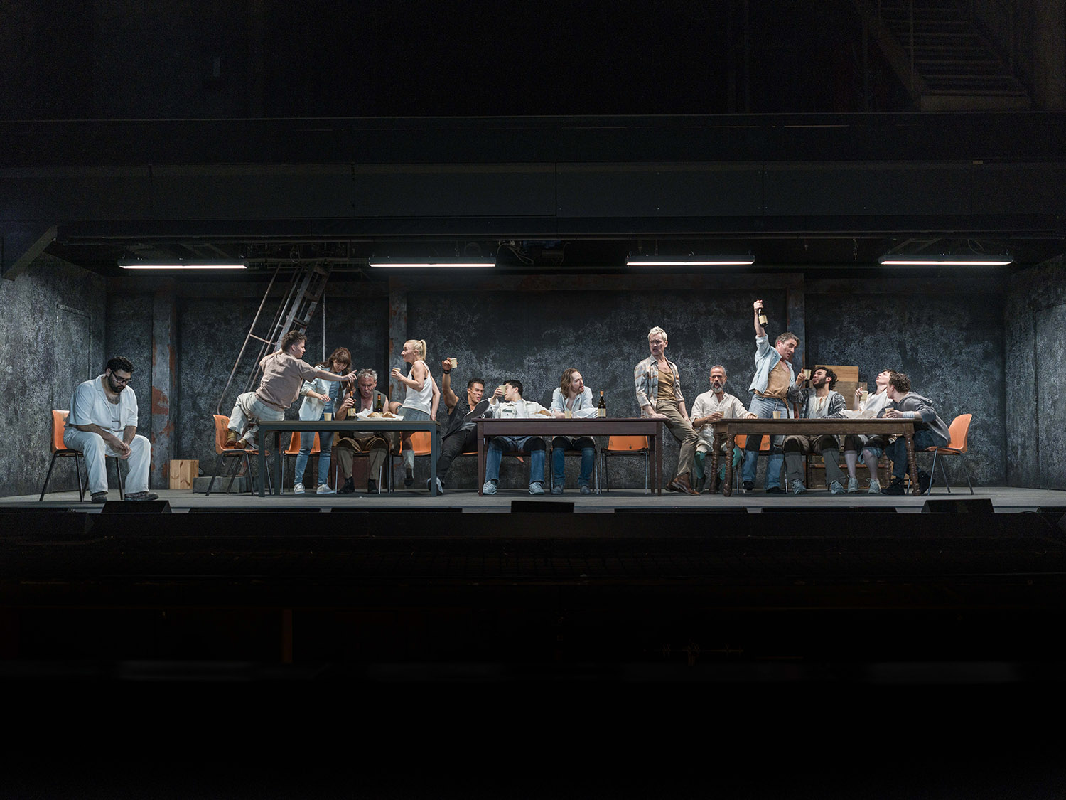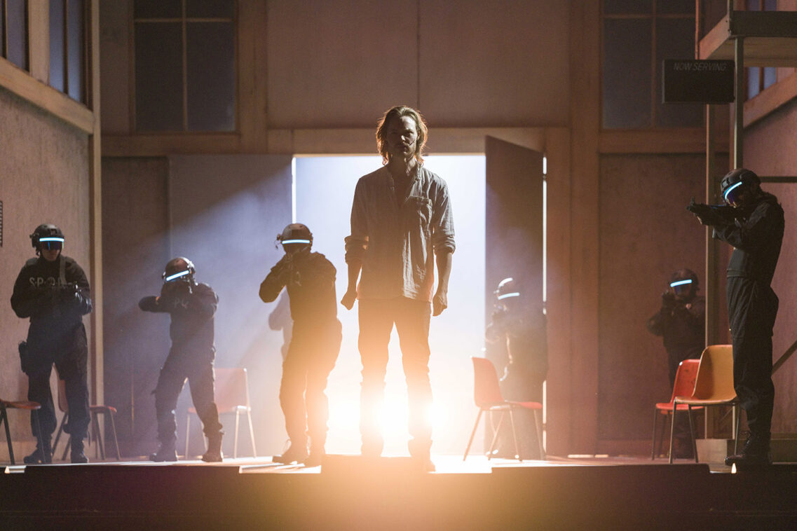 Das Bühnenbild von Momme Hinrichs beginnt bereits, bevor sich der Vorhang hebt: Eine Videoprojektion führt hinaus in die Wüste zu einem Gebäude, eingezäunt mit Stacheldraht. Dann öffnet sich der Vorhang auf einen nüchternen Warteraum mit orangefarbenen Stühlen und einem roten Cola-Automaten. Die Möglichkeiten der modernen Bühne werden optimal ausgeschöpft: Sie fährt hoch und gibt den Blick auf die Kellerszenen frei, ein großer Bühnenblock schiebt sich von links herein, der Wirkungsort der Hohepriester in ihrem abgeschotteten Machtbereich. Alles nüchtern, aber raffiniert.