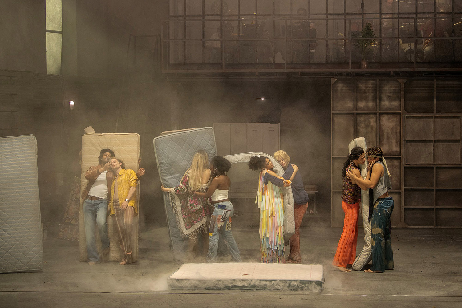 Sotiris Melanos hat ein unaufdringliches Bühnenbild geschaffen: eine Fabrikhalle, deren asketische Atmosphäre einen Kontrapunkt zur bunten Hippiekultur setzt. Die Bühne reicht über den Orchestergraben hinaus und schafft Nähe zum Publikum. In der hinteren rechten Ecke thront ein zweistöckiger Bau: Oben sitzt die Band, darunter spielen sich Claudes häusliche Szenen ab. Eine fahrbare Treppe setzt Claude und Sheila immer wieder gekonnt in Szene. Der omnipräsente Einkaufswagen mit umgekipptem Fernseher verdeutlicht die Schieflage der Außenwelt. Die Windmaschine beim Titelsong „Hair“ lässt die Mähnen fliegen und schafft ein bleibendes Bild. Wojciech Dziedzic feiert mit seinen Kostümen die Farben- und Musterpracht der Flower-Power-Ära. Haschisch, freie Liebe, viel nackte Haut, Spiritualität und der Kampf gegen das Establishment werden exzessiv zelebriert.