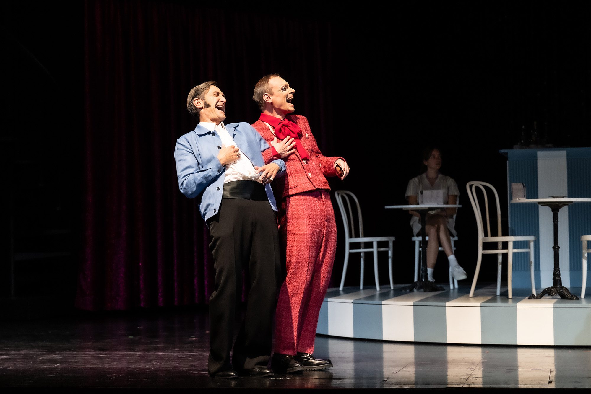 Schon in der Figur von Albin/Zaza ist diese Doppelung angelegt. Und wenn Vincent Glander mit tiefer, sonorer Stimme den Song „Mascara“ im Schlafzimmer singt, dann hilft das für den Auftritt aufgelegte Make-up auch gegen die Einsamkeit. Dass ihm manches Mal nicht nur das Kleid („Ich sehe, meine Titten hängen schief“), sondern auch die Intonation verrutscht, macht seinen Auftritt nicht weniger berührend. Und auch das Timing und die Leichtigkeit beherrscht der Schauspieler perfekt. Mit Victor Calero als Ehemann und Clubbesitzer Georges hat dieser Albin einen Partner auf Augenhöhe an seiner Seite, der die vielen gesanglichen Herausforderungen meistert und als lockerer, auch mal tanzender Conférencier die Fäden zusammenhält.