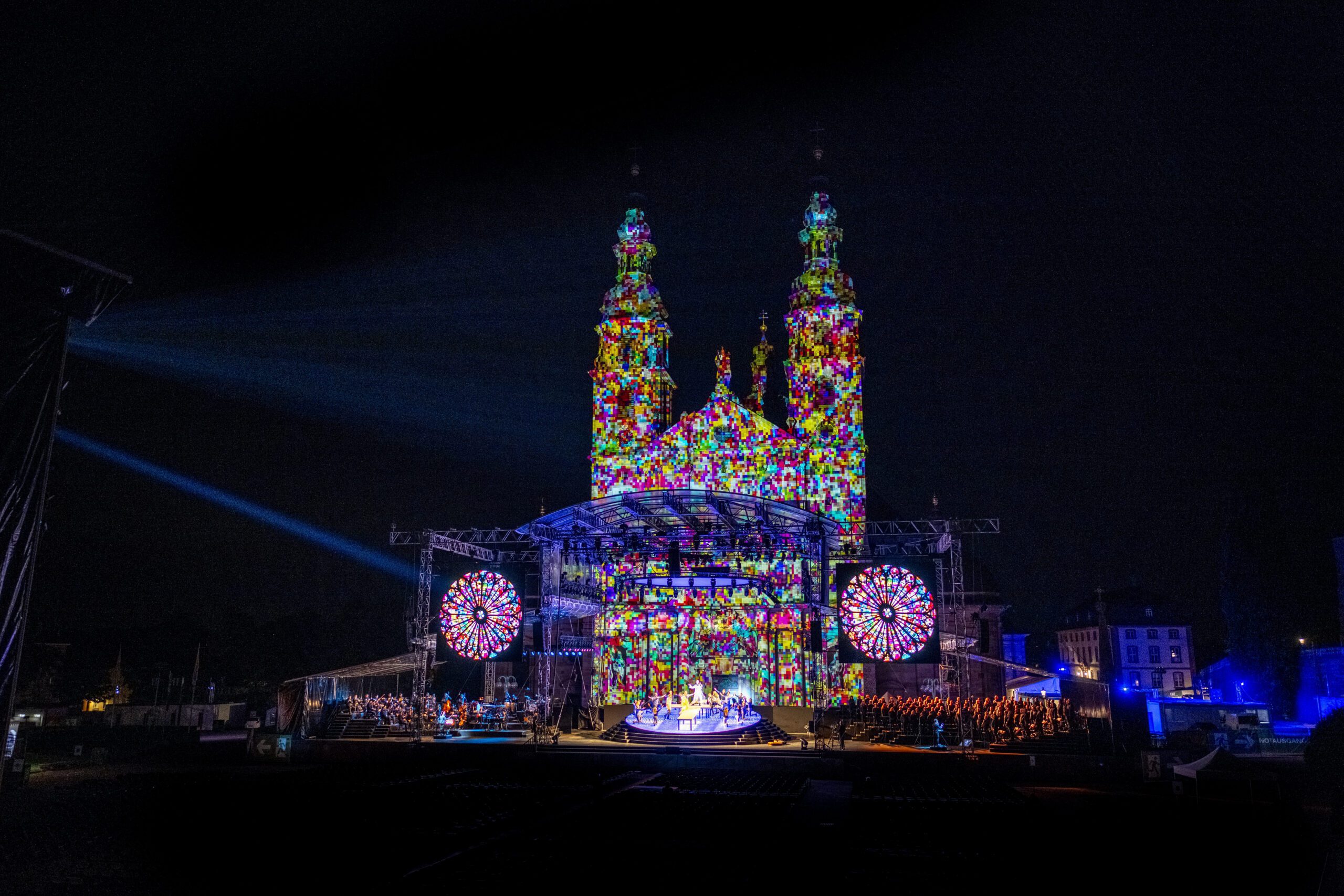 2010 folgte die Wiederaufnahme im Stadtschloss und 2019 die Uraufführung der Open-Air-Fassung von Stefan Huber. Frank Hollmanns Musikarrangement für die von Inga Hilsberg dirigierten Kölner Symphoniker bringt Wucht und Vielfalt, im Sounddesign von Tom Strebel bestens textverständlich. Unterstützt wird das Orchester durch 100 Sängerinnen und Sängern (Chorleitung: Marcel Jahn).
