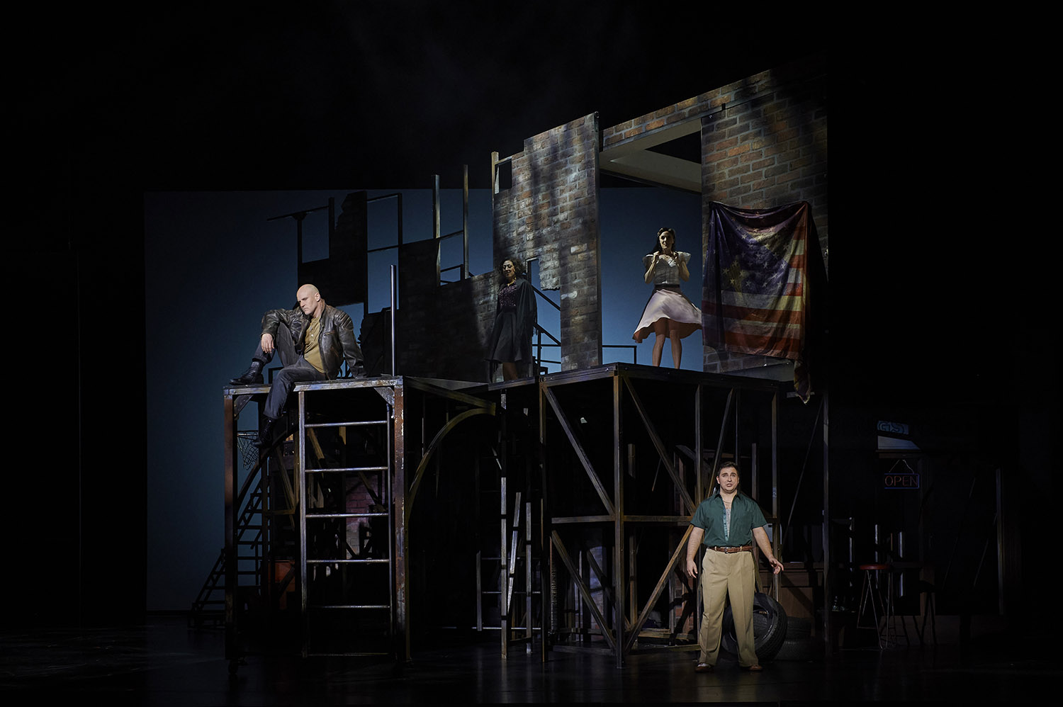 So steht und fällt alles mit den Darstellern und der Bühne. Letztere ist ein Meisterwerk, das Theater nutzt seine Drehbühne für einen zweigeschossigen Komplex, der alle Handlungsorte in einem Mikrokosmos zusammenführt und in der Hinterhofkulisse reichlich Treppen, Leitern und Verstrebungen bietet, in denen die Jets und die Sharks bei ihren Tanzszenen artistisch herumturnen können. Kostüme und Spielorte der puerto-ricanischen Sharks sind farbenfroh gemäß der Hoffnungen, mit denen sie in die USA kamen; die der US-amerikanischen Jets eher karg und gedeckt, passend zu ihrer Desillusioniertheit.