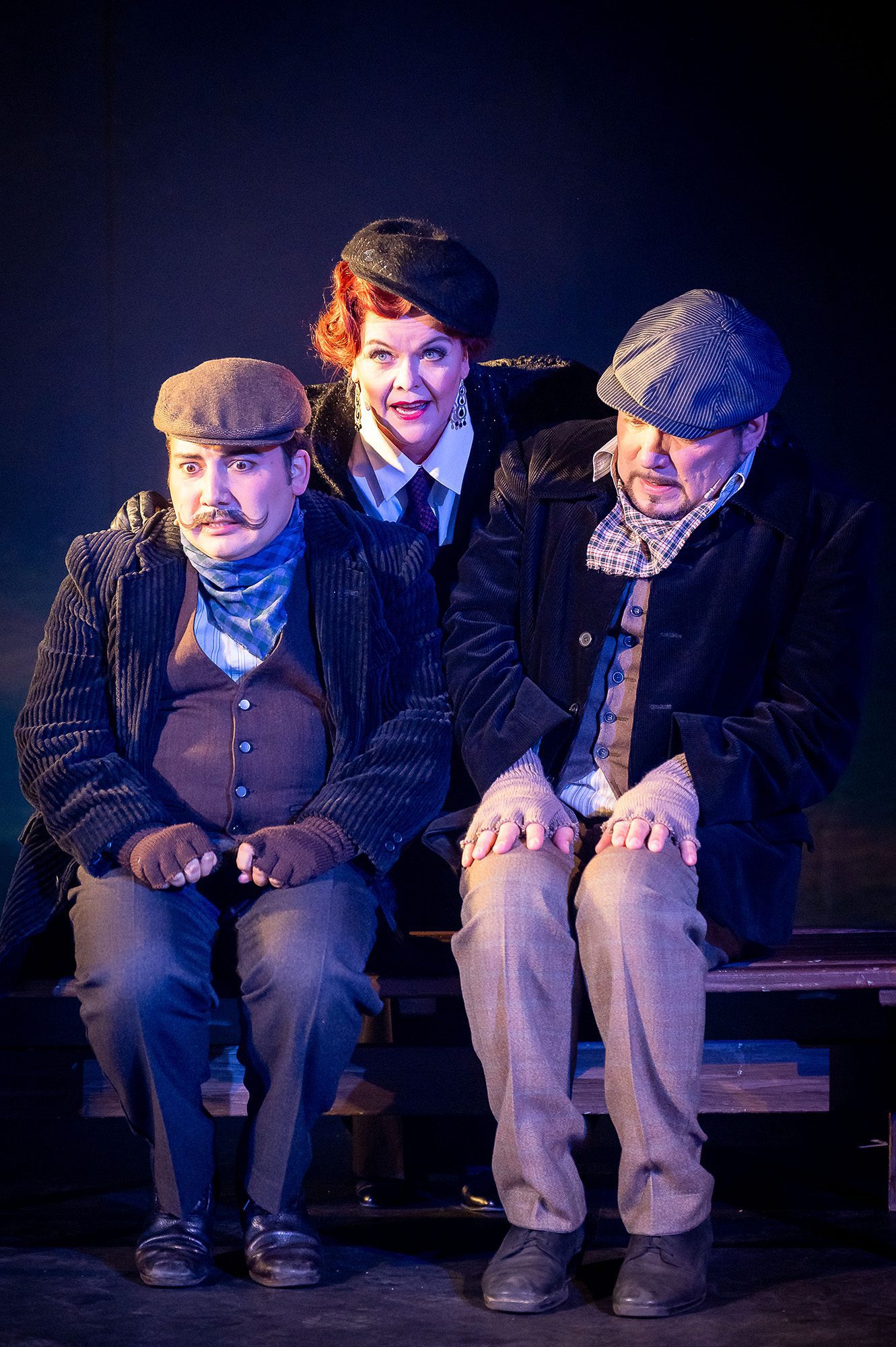 Eine herrlich komische Maskerade mit zwei raffiniert agierenden Hasardeuren gibt es dabei zu bestaunen. Ganz vorn spielt auch die umwerfende Bettina Pierags als verrucht-gerissene Colette Ganymare mit, Grande Dame der Unterwelt: Ihre Rolle gerät zum echten Kabinettstück. Mit manierierter Attitüde, Eros und Charme treibt sie es auf die kriminelle Spitze, navigiert dabei Francisco Huerta und Gijs Nijkamp als dumm-dreiste Hausganoven Jules und Jacques durch ihre sinistren Pläne. Christine Owen (Jane) und Lena Poppe (Mary) geben den Berry-Schwestern den nötigen Pfiff, um die hochstapelnden Detektive ehetechnisch um den Finger zu wickeln.