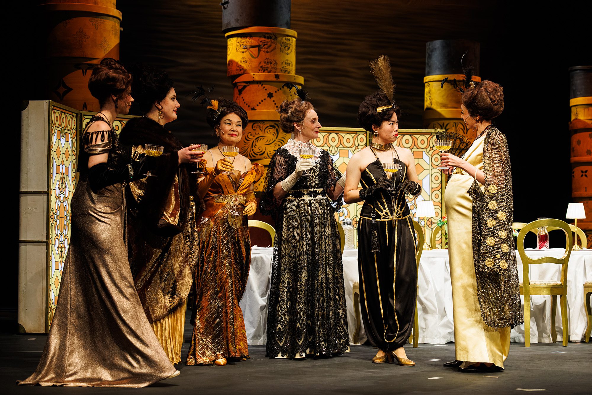Kein leichtes Unterfangen für Bühnen- und Kostümbildner Simon Lima Holdsworth sind die vielen Schauplätze; die Ausstattung muss auf alle Gastspielbühnen passen. Er entschied sich dafür, Tische, Treppen und rauchende Schornsteine aus Koffern und Hutschachteln aufzutürmen, die die Passagiere an Bord bringen. Zusätzlich gibt es rollbare Wandkoffer, die als Tür, Raumteiler und Wände genutzt werden können. In passenden Lichtstimmungen werden so wunderbar kreative Bilder erzeugt, etwa, wenn in den geöffneten Koffern kleine Lichter den Sternenhimmel zeigen oder beim Zusammenstoß Eisbrocken aus dem Wandkoffer fallen. Holdsworths Kostüme sind aufwändig und detailreich. Regisseur Matthias von Stegmann führt das große Ensemble sicher über die kleine Bühne, die manchmal schon sehr eng wird. Er schafft immer wieder fließende Übergänge, bei denen die Choreografie von Gesine Sand hilft. Von Stegmann koordiniert und verantwortet eine in jeder Minute überzeugende Produktion. Ein Mut, der mit ausverkauftem Haus belohnt werden sollte.