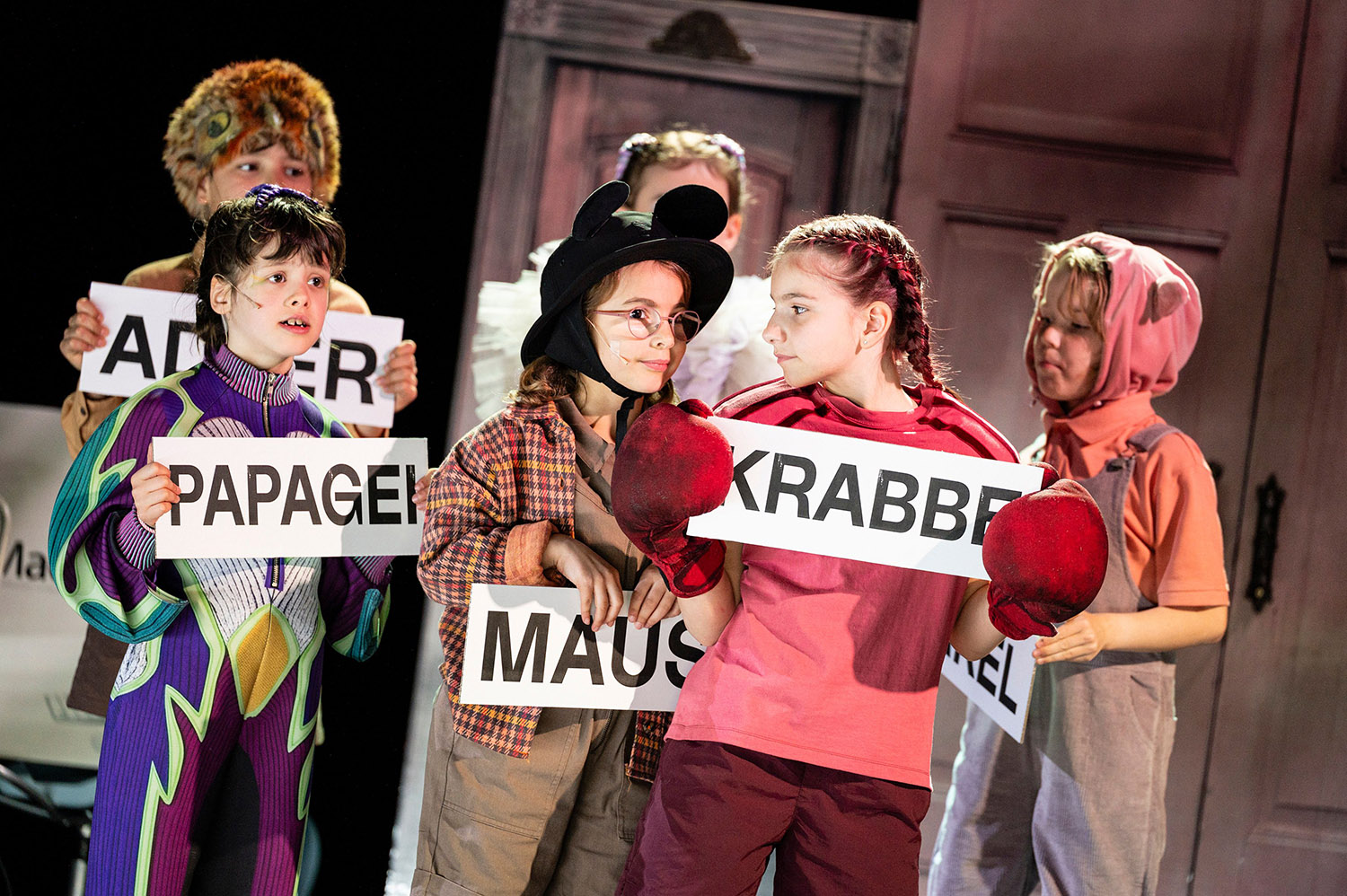 Die Choreographie von Nele Neugebauer ist eine Wucht. Die Kinder und Jugendlichen haben Bewegungen und Tanzschritte tief verinnerlicht und sichtbar Freude an den vielfältigen Ideen. Die Bühne von Vincent Stephan Großer versucht mit einer kippbaren Bühne, Zügen, roll- und drehbaren Türen, Hausfassaden und wenigen Requisiten Bühnenzauber zu ermöglichen. Beim Licht von Brigitta Hüttmann hätte man sich hingegen mehr Mut zur klaren Farbe gewünscht. Victoria Koberstein hat dezente Videoprojektionen eingefügt, die auf Bildschirmen oder per Beamer ins Bühnenbild integriert sind. Die Kostüme von Anna Rudolph bieten eine gute Mischung aus Bebilderung und Verfremdung. Klar, das Ferkel ist rosa, ohne den umwerfend spielenden Bela Harder einfach nur in ein Tierkostüm zustecken.