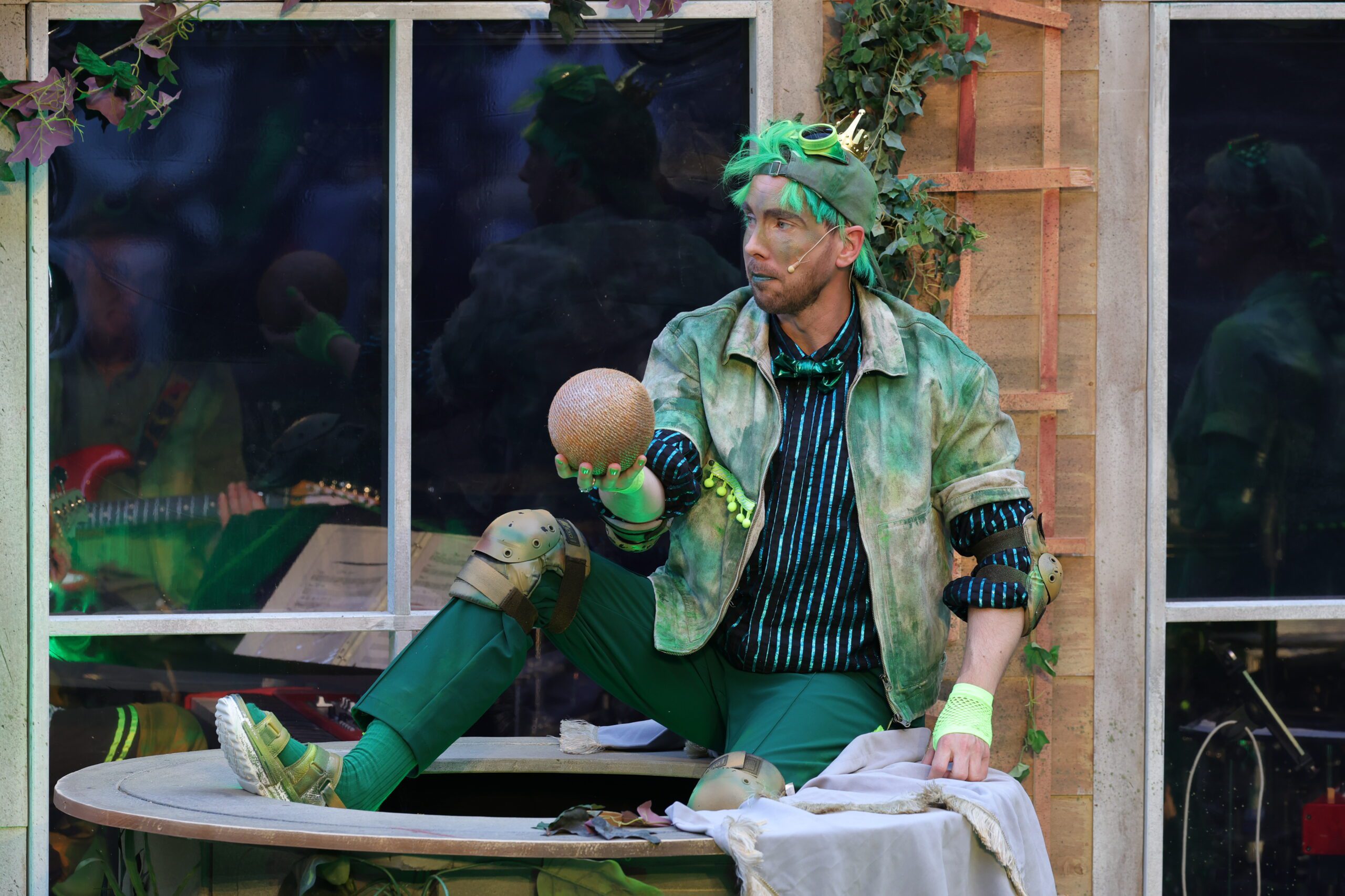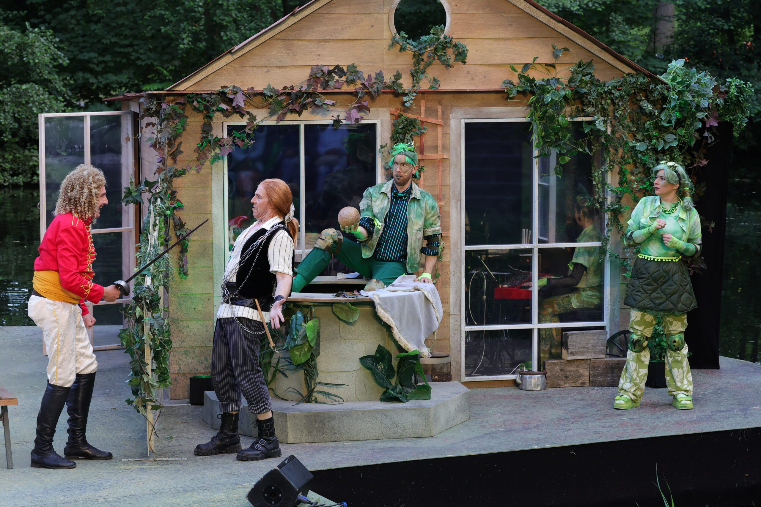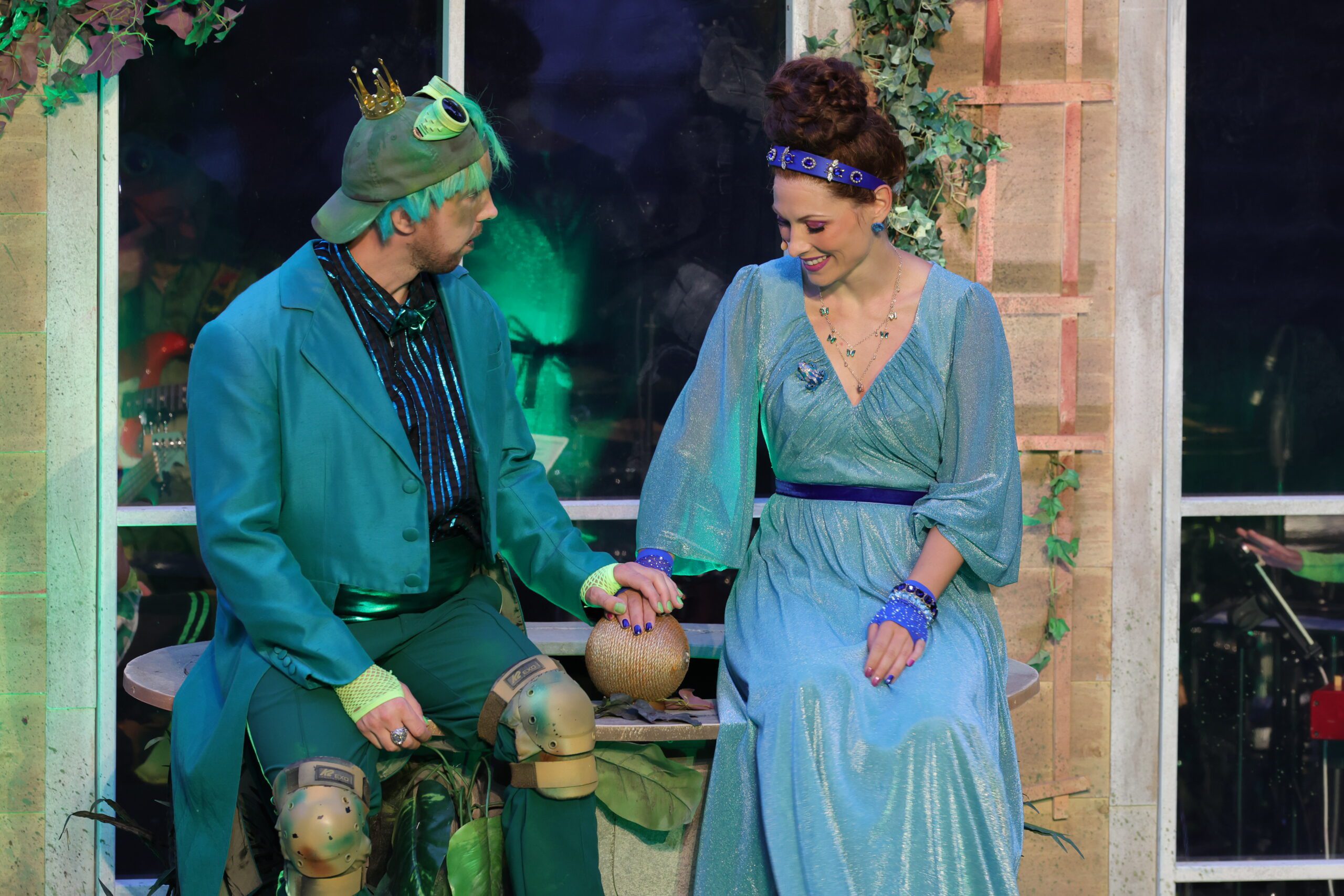 Neben dem Landhaus liegt der Tümpel. Wie passend, denn die Bühne schwimmt auf einem Ponton in einem Teich, den man sich bestens auch im Märchen vorstellen könnte. Hier ist Benjamin Hauschild als König Julius Herr über sein „Froschrudel“ und König der Frösche. Gemeint ist – wunderbarer Einfall – die hervorragende Liveband (Harry Stingl und Léonie Scharfe als musikalische Leiter mit Christian Friedrich Lang und Christian Schneider), die nicht nur musizieren, sondern auch quaken dürfen. Die Frösche lieben laute Musik, wildes Hüpfen, Mücken und ein Bad im Schlamm. Das passt so gar nicht zu den strengen Sitten am Hofe. Wunderbar in ihren Rollen auch die eifersüchtige „Fröschin“ Anja Dorrer und der treue Heinrich alias Adrian Kroneberger.