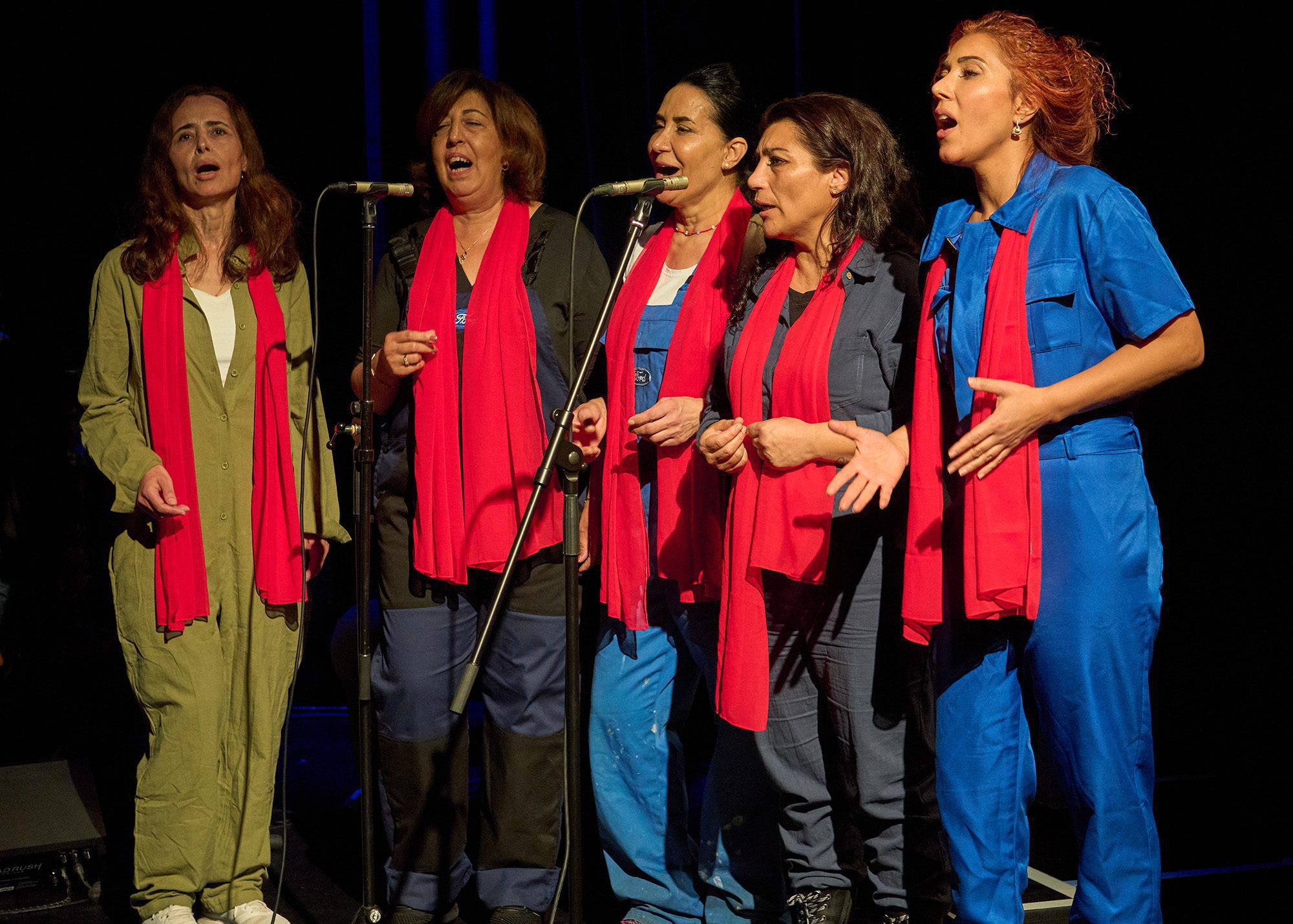 Während der Autor und Komponist des Stückes, Nedim Hazar, der auch die Rolle des Erzählers übernimmt, das Publikum auf das Stück einstimmt, nimmt im Bühnenhintergrund die durch drei Streicher verstärkte, dynamisch aufspielende Rockband unter Leitung von Klaus Mages Platz. Am rechten Bühnenrand postiert sich jener unvermeidliche „griechische Chor, der zu jedem türkischen Musical gehört“, wie die fünf bunt gekleideten Damen – allesamt Töchter der ersten Gastarbeitergeneration – mit fröhlicher Selbstironie anmerken. Apropos bunt gekleidet: Blaumänner und das Macho-Schwarz türkischer Jungmänner beherrschen die sterile Szenerie, die sich jedem künstlerischen Lichtdesign verweigert, geschweige denn mit einem Bühnenbild aufwartet.