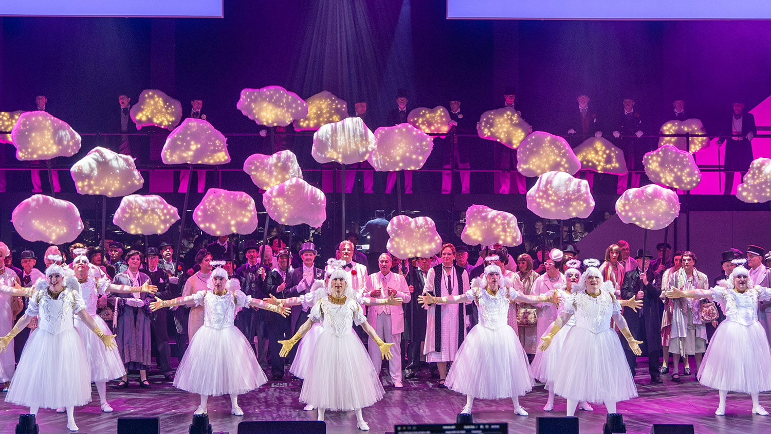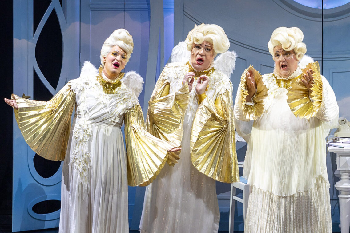 Und so fühlt man sich gleich wie im Kölner (Karnevals-)Himmel, der dann auch Schauplatz der Adenauer-Revue „E Levve för Kölle“ ist. Denn dort, über den Wolken, braut sich für das Geburtstagskind Unheil zusammen: Konrad Adenauer (Jürgen Nimptsch) soll nach 50 Jahren sein Kanzler-Himmelsbüro für seinen Nachfolger auf Erden, Ludwig Erhard (Stefan Bröcher), räumen. Seine Assistenz-Engel Jona (Simon Wendring), Luca (Manuel Anastasi) und Urbania (Volker Bader) sowie seine Büroleiterin Anneliese Poppinga (Wolfgang Semrau) versuchen, ihm die Anordnung von „oben“ schonend beizubringen. Aber eigentlich möchte er sein Büro behalten, nimmt er doch noch rege Anteil an der Kölner Kommunalpolitik, für die er gerade eine Software entwickelt: „WibOf“ – „Wie baue ich ein Opernhaus fertig“!