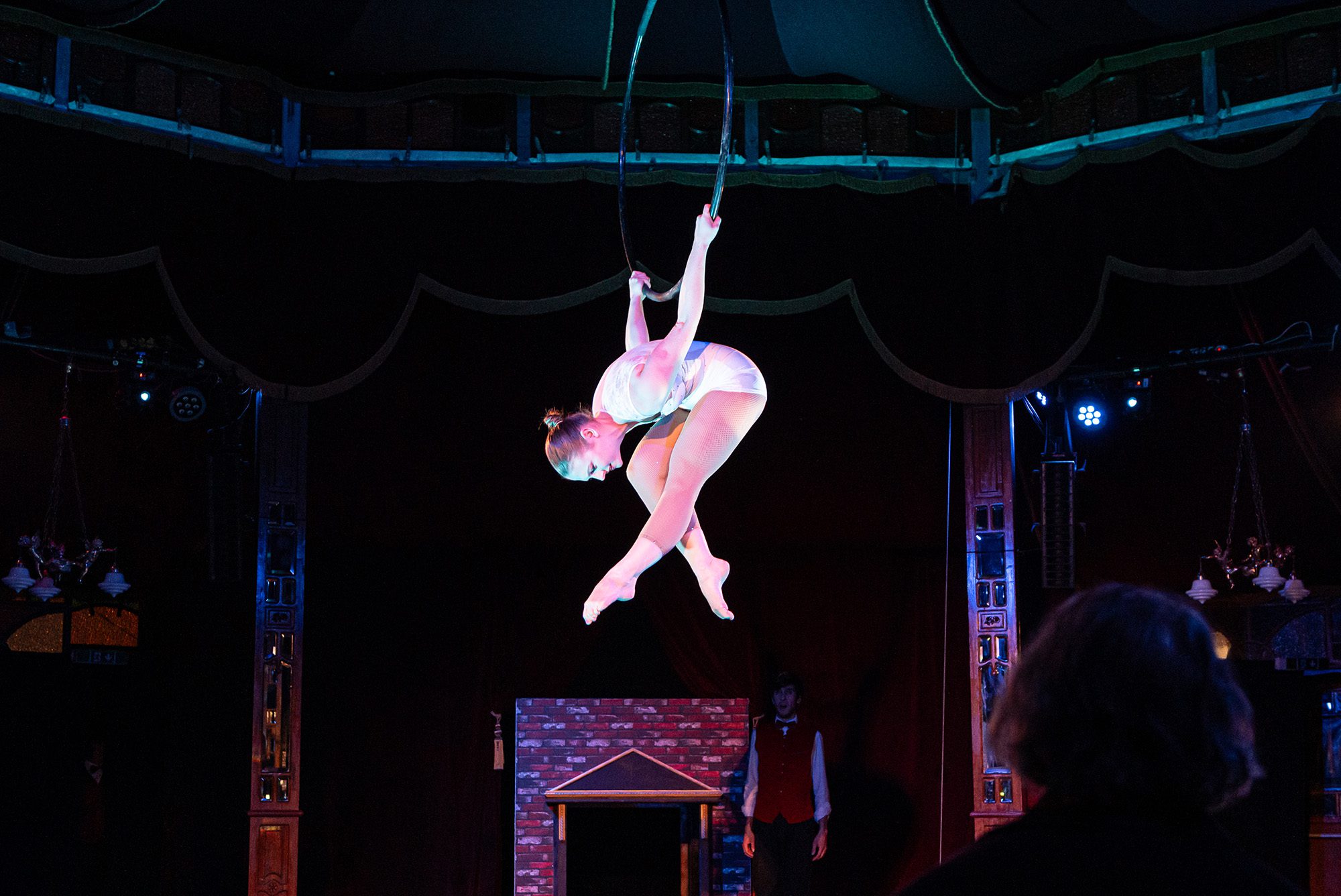 Natürlich darf auch mitgesungen werden, was vor allem bei den deutschen Weihnachtsliedern „Schneeflöckchen, Weißröckchen“ und „In der Weihnachtsbäckerei“ dankbar angenommen wird. Gar nicht zum Mitmachen zu Mute ist dem Publikum bei den atemberaubenden Varieté-Nummern: Wenn Lukas Köster gleich sechs durch die Luft „schießende“ Bälle einfängt oder Julia Grote, Klára Frühaufová und Petr Halko in einem überdimensionalen Hula-Hoop-Reifen unter dem „Zirkus“-Dach zu artistisch-poetischen Bildern verschmelzen. Leider hört man keine Songs aus dem Original-„Scrooge“-Musical von Leslie Bricusse, dafür aber die unvermeidlichen Songs aus Animationsfilmen wie „Die Schöne und das Biest“, „König der Löwen“ und „Anastasia“, von denen „Sei hier Gast“ immerhin dem Publikum aus dem Herzen gesprochen scheint: Es hat es offensichtlich genossen, sich in dieser außergewöhnlichen Theater-Atmosphäre auf die Weihnachtszeit einzustimmen.
