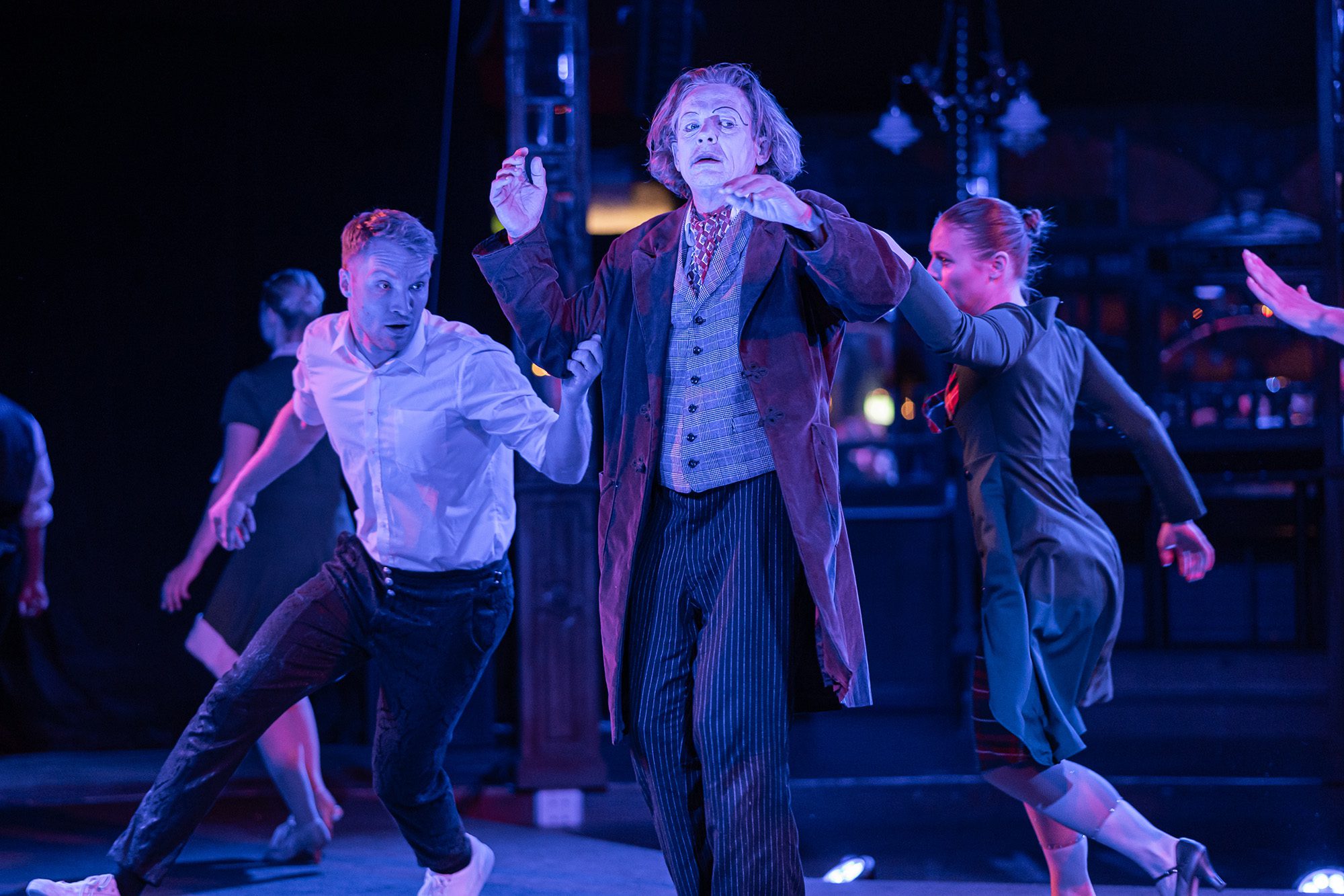 Musikalische Leitung: James Williams • Regie: Bettina Montazem • Choreografie und Bühne: Oleksii Shcherbliuk • Kostüme: Lea Johanna Montazem • Mit: Andreas Kunz (Scrooge), Noémie Pichereau (Clownin), James Williams (Scrooges Neffe), Lea Johanna Montazem (Frau des Neffen), Lena Leutner (Sängerin), Julia Grote (Verlobte von Scrooge), Lukas Köster (Jongleur), Klára Frühaufová (Tod), Petr Halko (Bob Cratchit), Laura Lutgen (Zuckerfee), Bibi Becker (Märchenoma) • Urania Voices (Sternsinger)