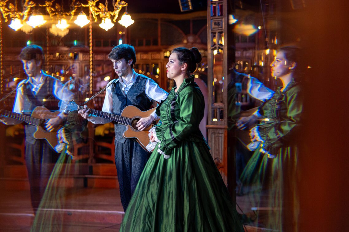 Aber da es sich um eine an das Genre Musical angelehnte Fassung handelt, wird schon beim ersten Song klar, welchen Ton ihre Inszenierung anschlägt. Voller Inbrunst singt Scrooges Neffe „We Wish You a Merry Christmas“. Da klingt schon die Hoffnung auf ein Happy End durch. Es bleibt nicht der einzige Song, mit dem James Williams glänzt. An der Seite von Montazems Tochter Lea Johanna (die die Frau des Neffen spielt) legt er mit „Twelve Days of Christmas” und „Hark! The Herald Angels Sing“ noch zwei stimmungsvolle Duette nach. Auch ein paar Tänzchen wagt das gesanglich und schauspielerisch gut harmonierende Paar, wird dabei allerdings von Oleksii Shcherbliuks Choreografien nicht gerade gefordert, wie auch das internationale Ensemble manchmal wie Kreuzfahrt-Animateure durchs Zuschauerrund tollt, um das Publikum zu einer Polonaise zu animieren. Immerhin rettet Laura Lutgen dann als Zuckerfee mit ihrem grazilen Spitzentanz den Ruf des Balletts.