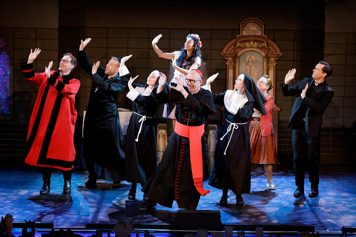 Und so begleiten wir den jungen Priester Elmar (Markus Schneider) aus der schwäbischen Provinz in die brodelnde Rhein-Metropole, in die ihn sein Vorgesetzter („Wir schicken immer unsere Besten nach Köln“) entsandt hat. Mit diesem Verweis auf den „unfehlbaren“, aktuellen Bischof Woelki hat man das Publikum sofort um den Finger gewickelt. Das soll sich während des Abends noch steigern, wenn der ganze Saal das „Kölner Echo“ gibt und inbrünstig „Drink doch ene mit“ anstimmt oder sich für die Hymne des 1. FC Köln von seinen Sitzen erhebt. Doch bis dahin gibt es noch einige Problemknoten zu lösen: Gerade angekommen, trifft Elmar Kathy (Nadine Kühn), die ihren Junggesellinnenabschied feiert und festgestellt hat, dass sie von einem Seitensprung schwanger ist. Wie soll sie das ihrem Verlobten Mattes (Raphael Grosch) erklären? Elmar bietet sich als Seelentröster an – und gemeinsam machen sie sich auf die Suche nach dem zukünftigen Ehemann, um ihm den Fehltritt zu beichten.