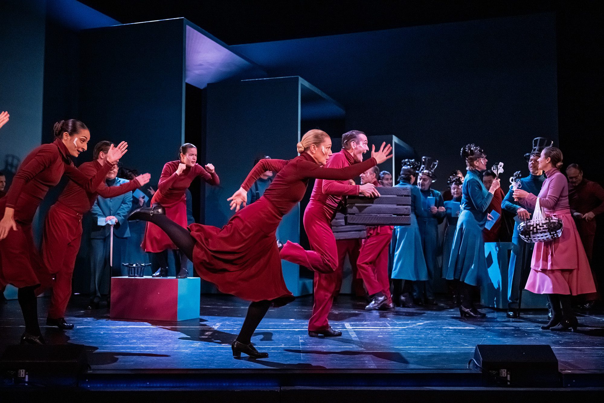 Regisseurin Ella Marchment will ungewohnte Akzente setzen, Gewichte verschieben, sich auf soziale Gegensätze konzentrieren. Ein bemerkenswertes Konzept, vom ersten Moment an konsequent realisiert. Vor einem riesigen, violettfarbenen Kasten spielt ein Mädchen mit Stabpuppen. Es ist die junge Eliza, die sich in eine andere Welt träumt. Am Schluss wird die Erwachsene ihrem Lehrer Higgins nicht vor den Traualtar folgen. Ein letztes Wort, eine finale Geste, dann verlässt sie den Professor endgültig, weil er seine Marotten behalten will und der ehemaligen Schülerin niemals auf Augenhöhe begegnen kann. Das Ganze passiert in einem abstrakten Raum: verschiebbare Wände und Quader, kaum Mobiliar platziert Philomena Strack auf der Drehbühne. Rot-Töne und Türkisgrün dominieren, auch bei den von Sascha Thomsen entworfenen Kostümen. Es sind Attribute für die Klassenzugehörigkeit. Die Aristokraten stolzieren mit angedeuteten Hüten und Fracks durch London, die alte Ordnung scheint fragil, aus den Fugen geraten.