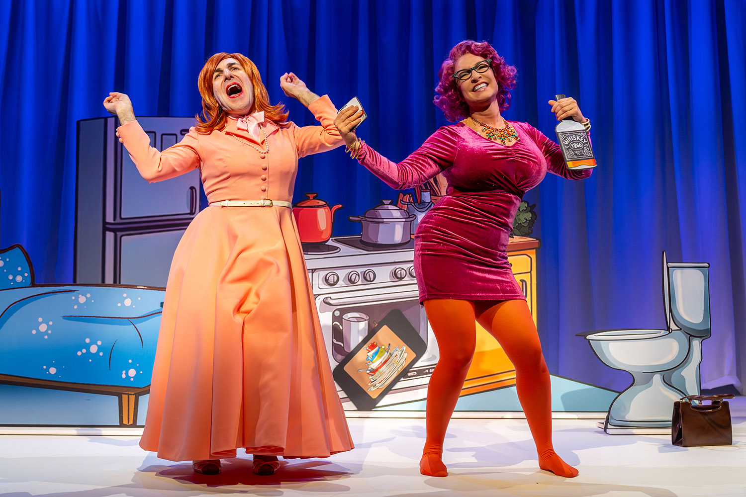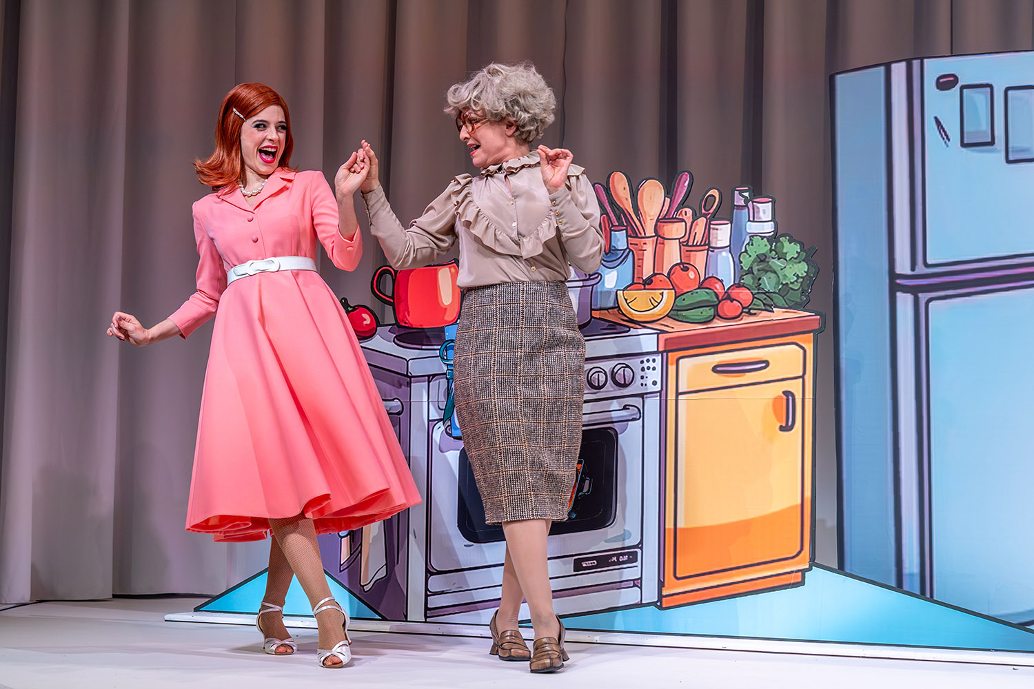 So werden die Augen ständig verwöhnt, während sie dem bizarren Spiel folgen. Irgendwo im New York der 60er Jahre leben zwei Stadtneurotiker, der Detektiv Morris Brummel (Florian Soyka) und der arbeitslose Schauspieler Christopher „Kit“ Gill (Fehmi Göklü). Beide haben eins gemeinsam: Sie leiden unter ihrer Mutter-Beziehung. Kit wird noch aus dem Jenseits von seiner verstorbenen Mama Alexandra, einer einst gefeierten Schauspielerin, als Versager abgestempelt. Der Mittdreißiger Morris lebt dagegen bei seiner verwitweten Mutter Flora (Claudia Dilay Hauf), die ihm ständig seinen ungleich erfolgreicheren Bruder vorhält. Und beide träumen davon, auf der Titelseite der „New York Times“ zu stehen: Kit als Serienmörder, der immer wieder in andere Rollen vom Pfarrer bis zum Tanzlehrer schlüpft, um sein schauspielerisches Talent zu beweisen – und Morris als der, der ihn zur Strecke gebracht hat. Warum also nicht gemeinsame Sache machen, denkt sich Kit und bezieht Morris durch Telefonate und Psychospielchen immer mehr in seine Morde ein. Als Morris dann während seiner Ermittlungen die Galeristin Sarah (Marlene Jubelius) kennen und lieben lernt, gerät die ins Visier von Kit …