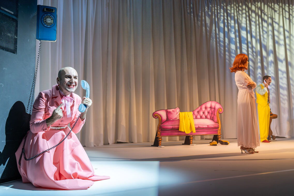 Die beiden schicken ihre vier Protagonisten in knallbunten, pastellfarbenen Kostümen auf eine durch einen halbrunden, weißen Vorhang eingegrenzte, leere Spielfläche. Darauf fährt die Drehbühne dann immer wieder wie aus einem Kinder-Bilderbuch ausgestanzt wirkende, zweidimensionale Requisiten: mal ein Bett, eine Tür, einen Schrank oder eine Couch. Im ersten Moment wirken sie nur wie hübsch anzusehendes Dekor, doch dann werden sie ab und zu durch dreidimensionale Überraschungs-Effekte zu Gebrauchsgegenständen.