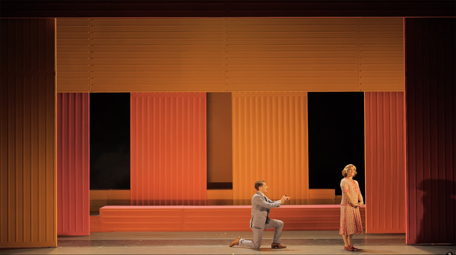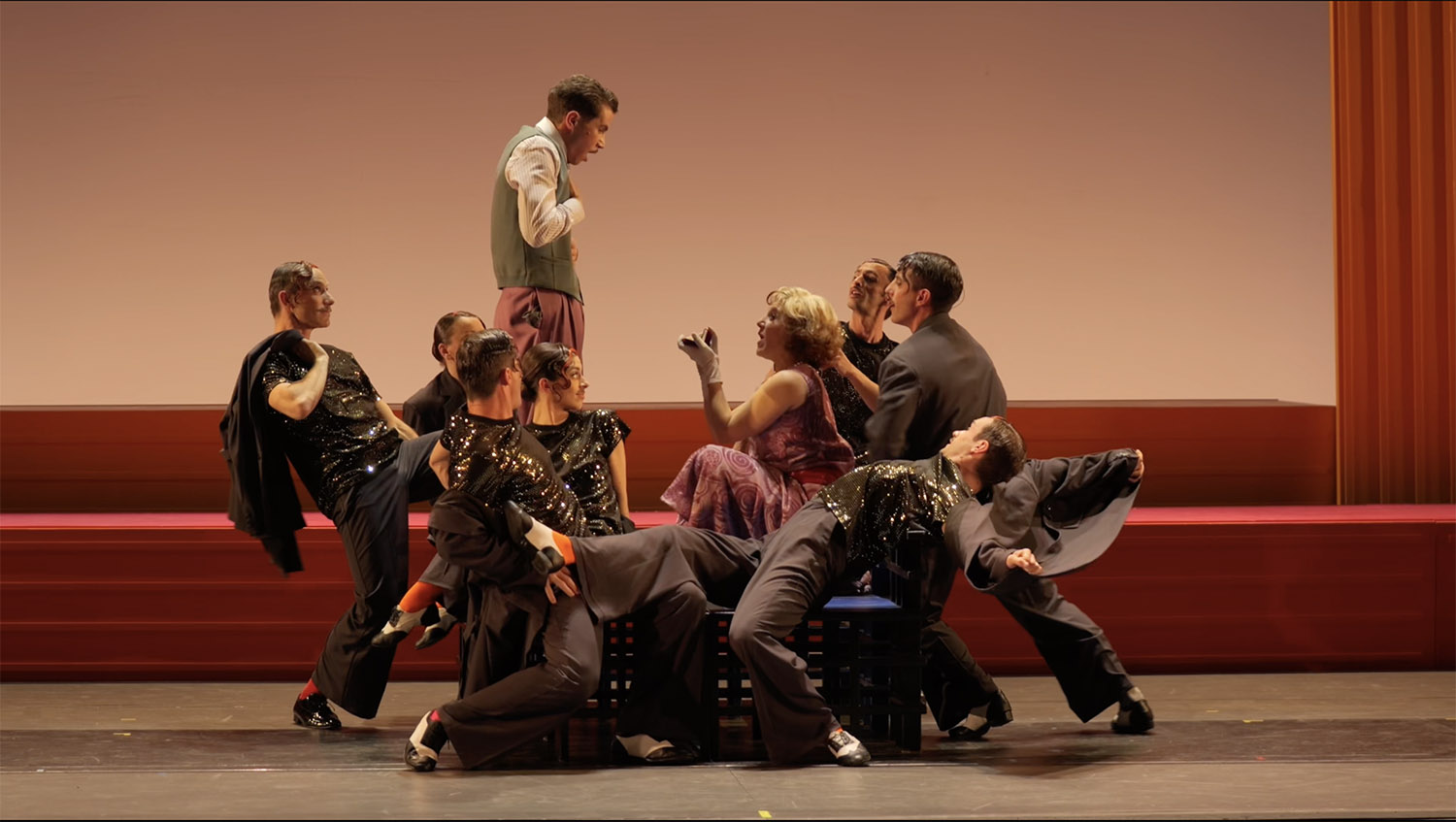 Das beginnt beim originellen, wenn auch minimalistischen Bühnenbild, das nur aus roten, gelben und orangefarbenen Hängern besteht und flexibel mal das weite Strandbild, mal ein intimes Zimmer repräsentiert. Es ist ein idealer Rahmen für die Geschichte um den Bibel-Verleger Jimmy Smith, der sich mit Hilfe seines Freundes Billy seiner verflossenen Liebschaften entledigen will und außerdem seines Mündels Nanette, die bei allem „No, No“ doch nur am bunten Leben teilnehmen möchte. Im fabelhaft schlichten Bühnenbild von Oria Puppo, die auch für die stilechten 1920er-Jahre-Kostüme verantwortlich zeichnet, wirken die Szenen (Regie: Emily Wilson und Jos Houben) wie in einer Vitrine ausgestellt.