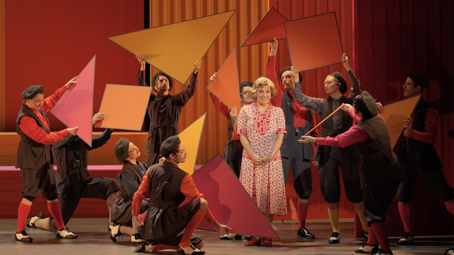 Ohne unnötigen Pomp gelingt es trotz der etwas surrealen Bühnenumgebung vortrefflich, eine rasante, spannungsgeladene und temporeiche Komödie à la Georges Feydeau auf die Bühne zu bringen, ohne dabei uncharmant zu sein – im Gegenteil! Befeuert durch köstliche inszenatorische und choreografische Einfälle (etwa der Boxkampf der drei Verflossenen) wird die Geschichte auch in den Tanzszenen pointiert forterzählt – weit über das Maß des effekthascherischen Showstoppers hinaus. Perfekt dargeboten wird dies vom unisono rot-schwarz gekleideten Tanzensemble, das im ganzen Stück kommentierend dabei ist und höchst fantasievoll mit bunten geometrischen Figuren (Dreiecken, Trapezen, Vierecken) die „fehlende“ Ausstattung ersetzt – und damit am Ende einer bürgerlich-verstockten Gesellschaft und deren Doppelmoral den Spiegel vorhält.