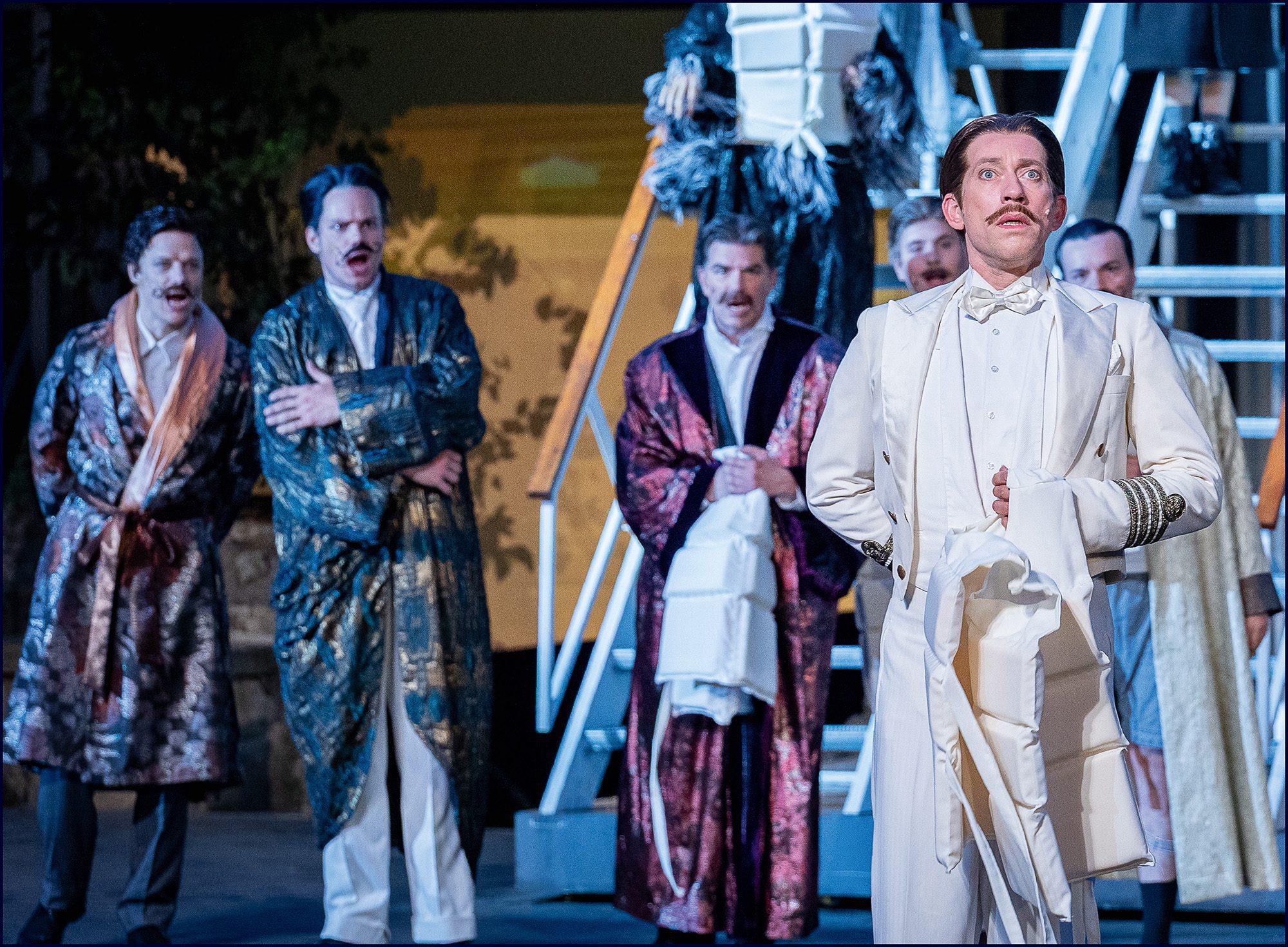 Musikalische Leitung: Juheon Han • Choreografie: Francesc Abós • Bühne: Jens Janke • Kostüme: Fabienne Ank • Digital Artist: Bonko Karadjov • Mit: Benjamin Eberling (Kapitän Edward John Smith), Alexander di Capri (Thomas Andrews), Felix Martin (J. Bruce Ismay), Til Ormeloh (Heizer Frederic Barrett/Benjamin Guggenheim), Tobias Bieri (Harold Bride/J. H. Rogers (Jay Yates)), Anton Rattinger (Isidor Straus), Masha Karell (Ida Straus), Gerben Grimmius (Henry Etches/Wallace Hartley), Nicolai Schwab (Fredrick Fleet), Michael B. Sattler (Jim Farrell), Bettina Meske (Alice Beane), Patrick L. Schmitz (Edgar Beane), Laura Araiza Inasaridse (Kate McGowan), Hannah Miele (Kate Murphy), Gioia Heid (Kate Mullins), Hector Mitchell-Turner (Charles Clarke), Elena Franke (Caroline Neville), Jan Altenbockum (Charles Lightoller, 2. Offizier), Mathias Meffert (William Murdoch, 1. Offizier), Christian Rosprim (Herbert Pitman, 3. Offizier), Niklas Roling (Robert Hichens, Rudergänger), Tim Grimme (Joseph Boxhall, 4. Offizier), Lorenzo Eccher (Andrew Latimer), Jan Altenbockum (John J. Astor), Oriol Tula (George Widener), Michael Berres (John Thayer), Elena Franke (Caroline Neville), Caroline Hat (Madeleine Astor), Bernadette Fröhlich (Marion Thayer), Giulia Fabris (Mme Aubert), Nadine Baas (Eleanor Widener), Esther-Larissa Lach (Charlotte Cardoza) • Chor und Orchester der Freilichtspiele Tecklenburg