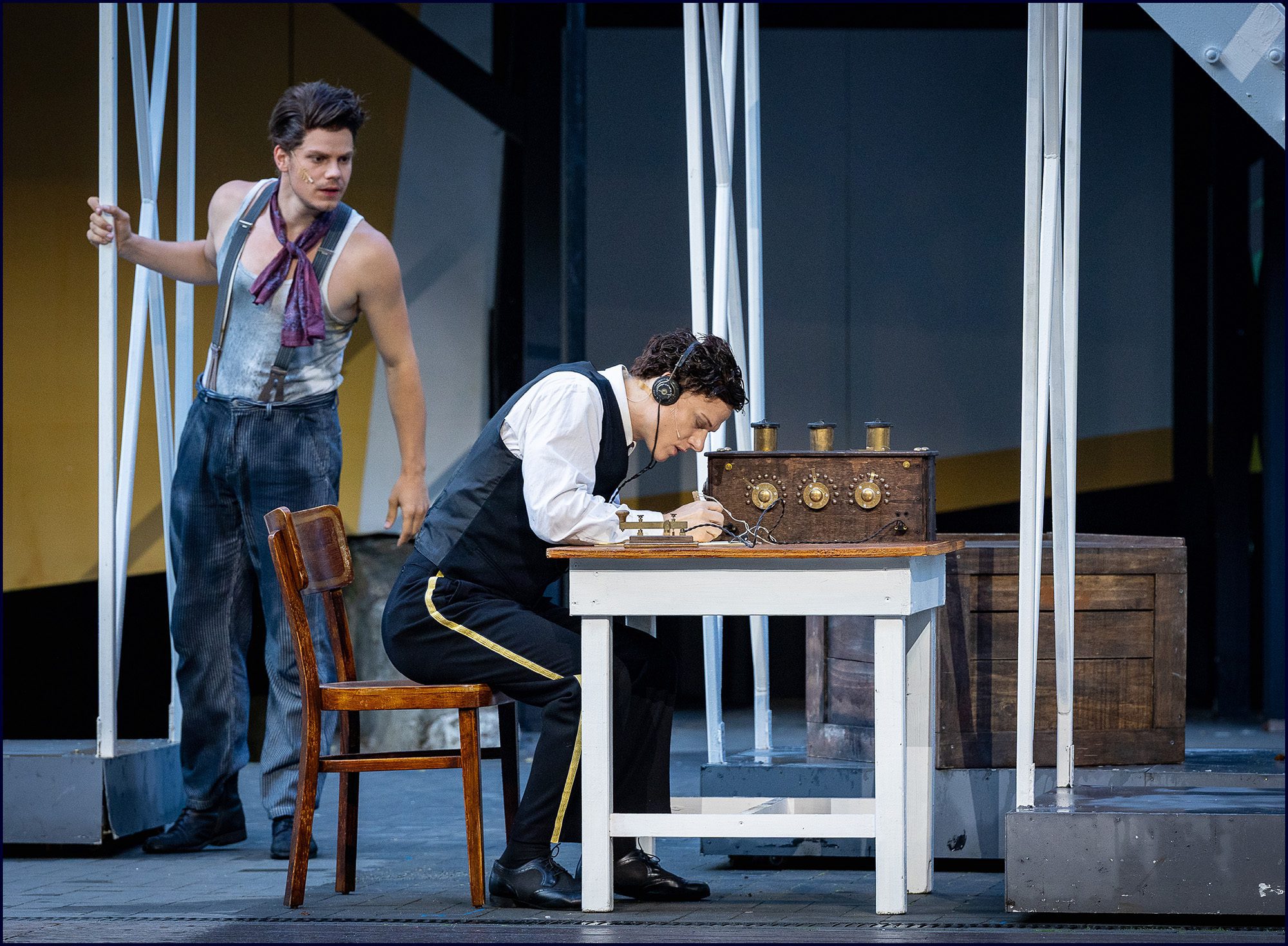 Tränen überall, auf der Bühne und bei den Zuschauern – vor Rührung, Trauner, Angst, Wut und vor Begeisterung. Bis alle Passagiere der drei Klassen an Bord sind und das Schiff zu seiner Jungfernfahrt aufbricht, vergehen 20 Minuten. Die hier schon – bei aller Vorfreude – bedrohlich klingende Musik (Musikalische Leitung: Juheon Han) von Maury Yeston tönt voll und differenziert im ganzen Rund. Das rund 60-köpfige Ensemble liefert einen fulminanten Chorklang, die Kostüme (Fabienne Ank) zeigen klar die Klassenunterschiede. Und dann dieses Schiff: Jens Janke zaubert die Illusion, dass es auf drei Etagen über die gesamte Bühnenbreite geht. Links auf dem alten Brunnen ist der erste Schornstein, zwei auf der Hauptbühne, der vierte schließlich rechts über dem hohen Tor. So entsteht optisch sofort eine Schieflage. Und auch das Ende nimmt Regisseur Ulrich Wiggers bereits vor Beginn vorweg. Wie auf dem eiskalten Meer nach der Katastrophe liegen überall Ausstattungs-Gegenstände herum. Dann der Anfang, und schließlich stehen alle Beteiligten überall auf der Bühne, auf den vielen Treppen, auf allen Ebenen und singen das „Lebewohl bis zur Wiederkehr“ – nicht ahnend, dass die Verkettung von so vielen ungünstigen Entscheidungen schließlich das unsinkbare Weltwunder zum Untergang zwingen. Der perfekte Theatermoment.