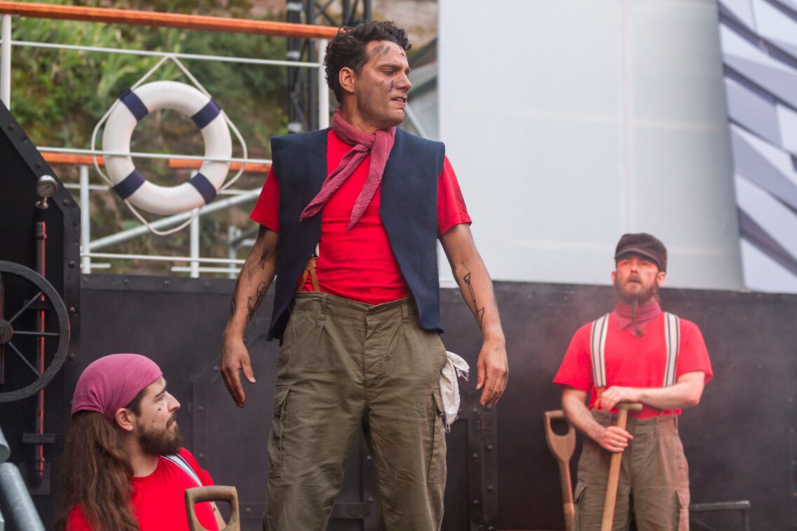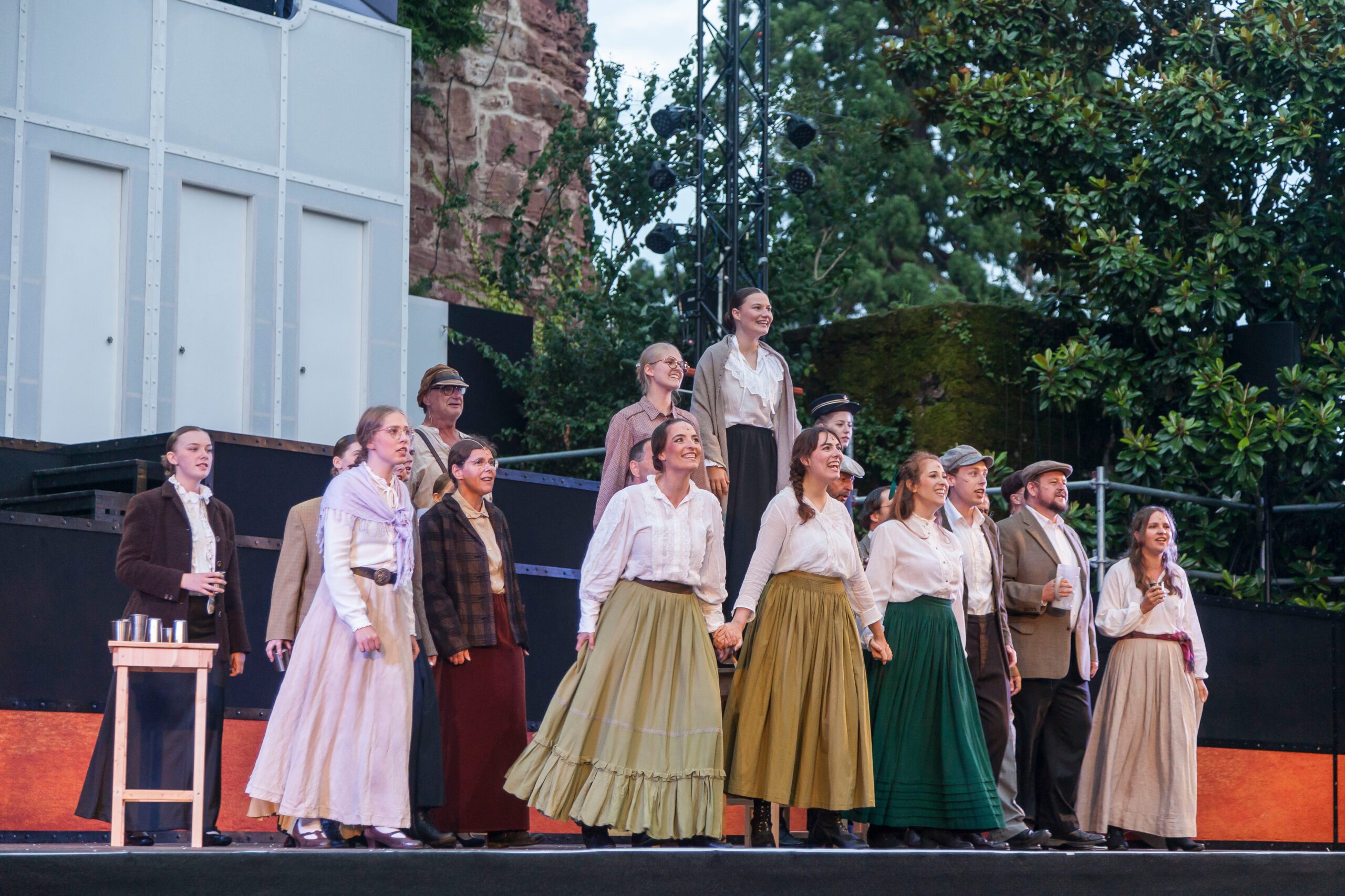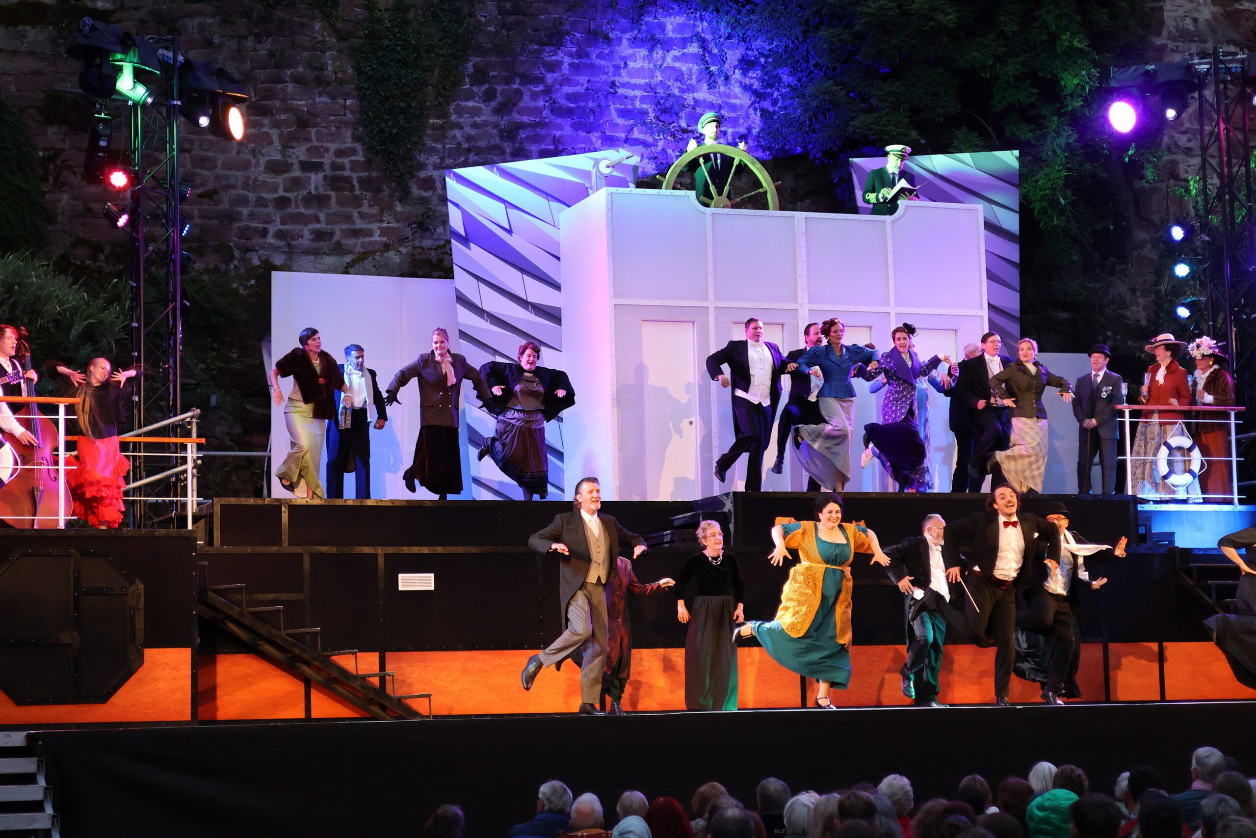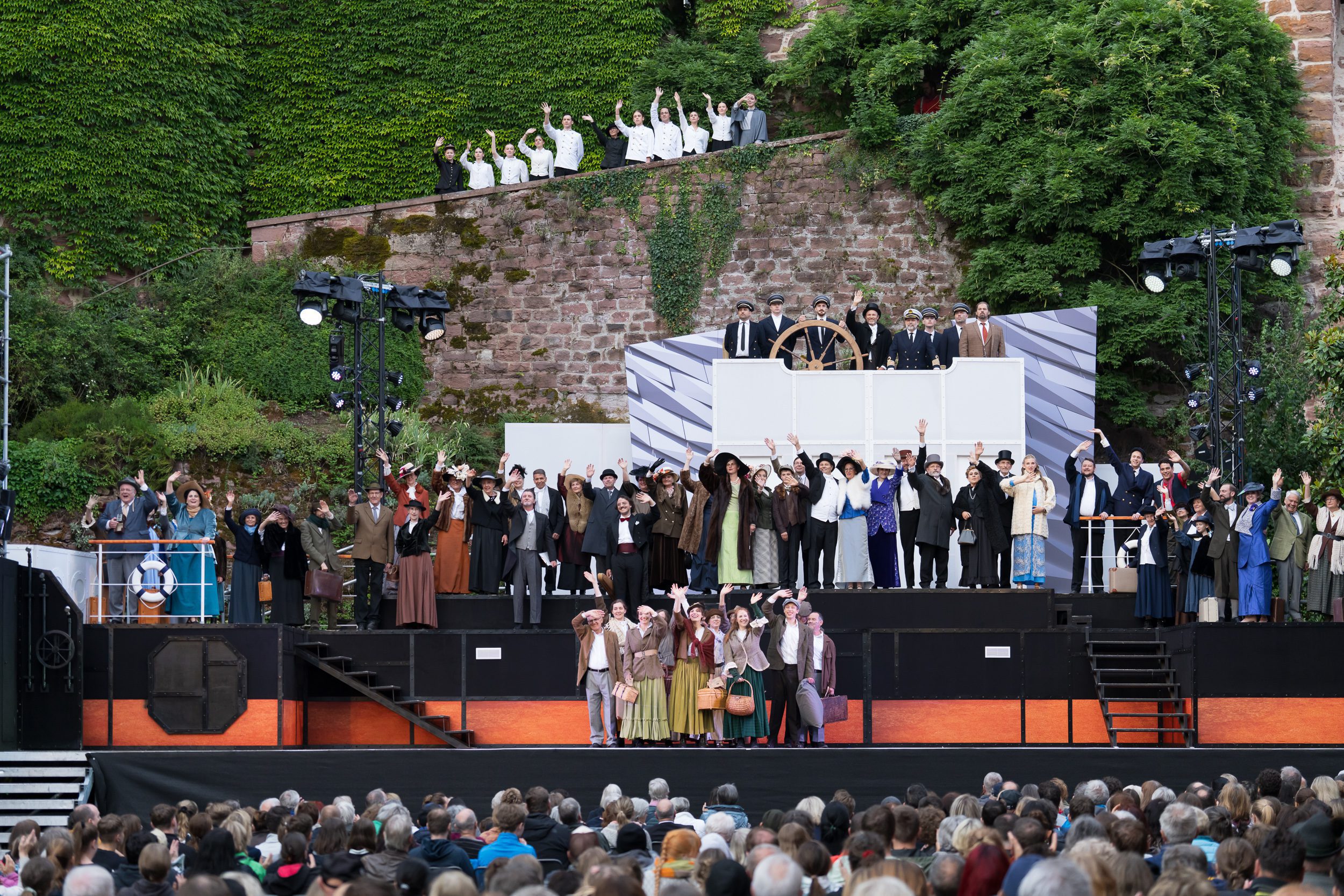 Seit Intendant Rainer Roos 2015 die künstlerische Leitung der Festspiele übernommen hat, ist das Musical im Schlosshof von Zwingenberg eingezogen und hat das winzige Neckar-Städtchen zu einer kleinen, aber bedeutsamen Spielstätte gemacht. Etliche junge Sänger haben hier ihre ersten großen Rollen gesungen und einige kommen auch gerne wieder, so wie Patrick Stanke, der in diesem Jahr mit „Titanic“ seine erste Regiearbeit abliefert und auch in einer wichtigen Rolle zu erleben ist. Es ist die größte Musicalproduktion bisher: Unmengen von Rollen und ein 18-köpfiges Orchester waren zu besetzen, das Bühnenbild mit den vielen verschiedenen Ebenen ist eine Herausforderung. Aber dem erfahrenen Bühnenbildner Helmut Mühlbacher gelingt es erneut, die Bühne im Schlosshof mit ihren besonderen Gegebenheiten spektakulär in Szene zu setzen.